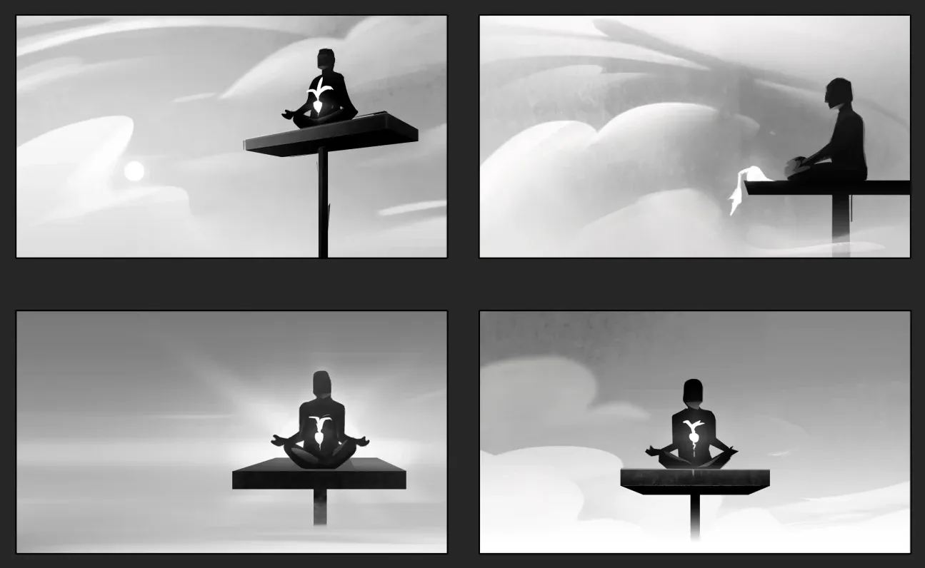 The next step was layout sketches for the 4 scenes, based at that stage on only brief descriptions I had of each scene, and what would happen in each. While Lucy did some brief notebook sketches, almost all were drawn straight to digital with tablet and stylus. The monk-on-a-pole seemed the easiest, so this went straight to striking black and white layout options: