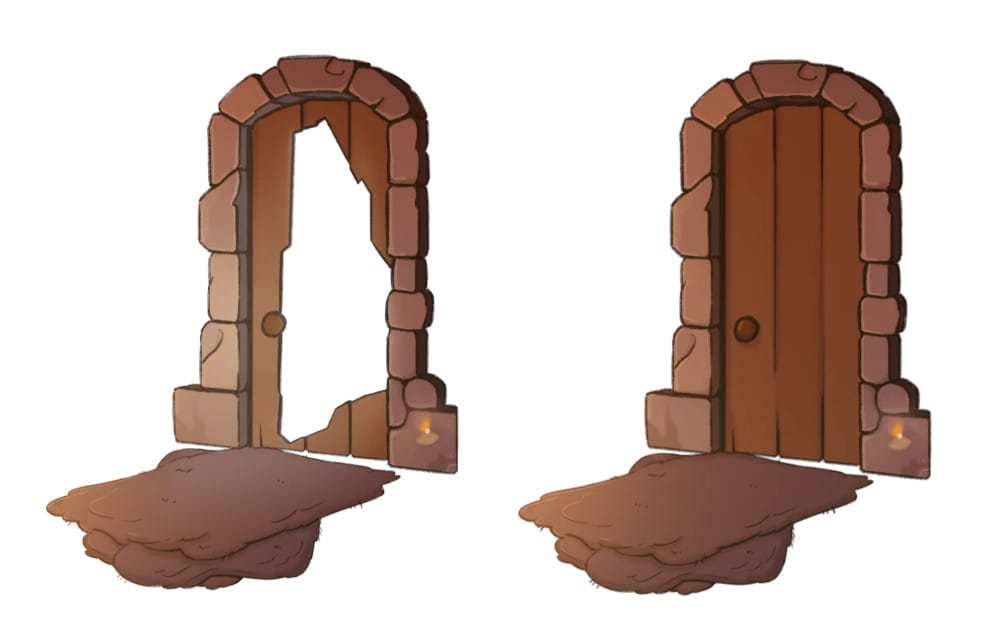 Note that the layer for the door also includes the paving in front of it and the stone around it, so that it can be bright and lit with the open door, and darker in the 'shut' state.