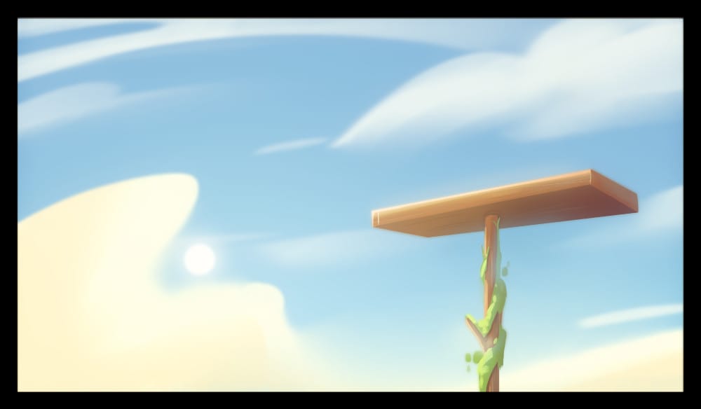 But today, we're going to share the stages through which we developed the background art, with the amazing Lucy Gillespie! We bonded over a mutual love of clouds in Studio Ghibli movies, as I wanted clouds to be a big part of the visual language of The Protagonish. But I'd never done any art development before, so Lucy brought a tonne of patience and professional experience from working on short films and TV series in the 2D animation industry. This was essential to correctly choose things like the desired final resolution and aspect ratio for digital assets, and the layers and formats that we could bring into our game engine.