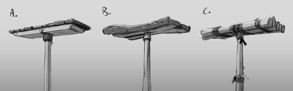 But we also chose at this stage the brush and line style, eventually going for a cartoony-painterly look, and also choosing the visual style through things like how curved elements were, as well as how broken or industrial our world would be. Choosing the more 'handmade' and rounded style in C, made for a more cozy world, all the more jarring for the Adventurer to threaten, and so nudging the player to work against him:
