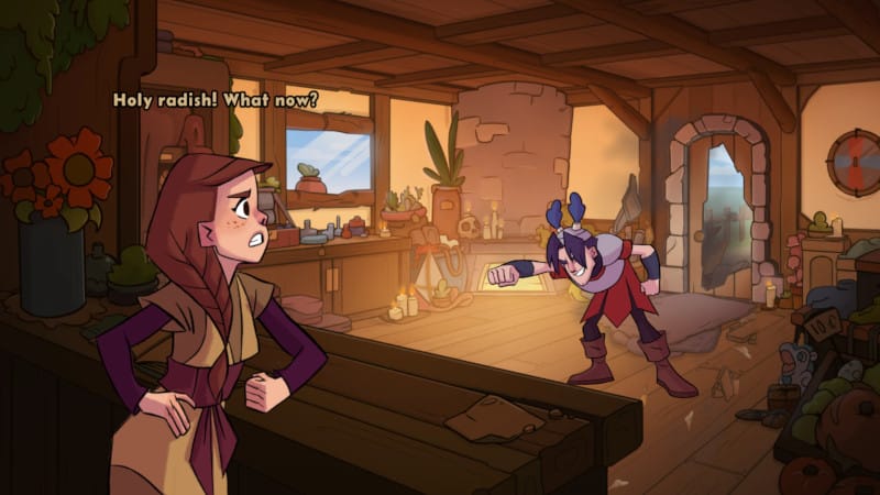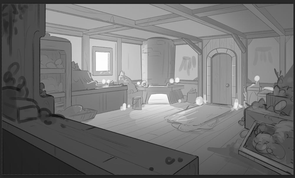 We went through many iterations of the colours and saturation in this scene, trying to make it noticeably 'inside' and so a bit darker that the outdoor scenes, but also not too gloomy, but cozy, again setting a peaceful mood that The Adventurer is destroying.